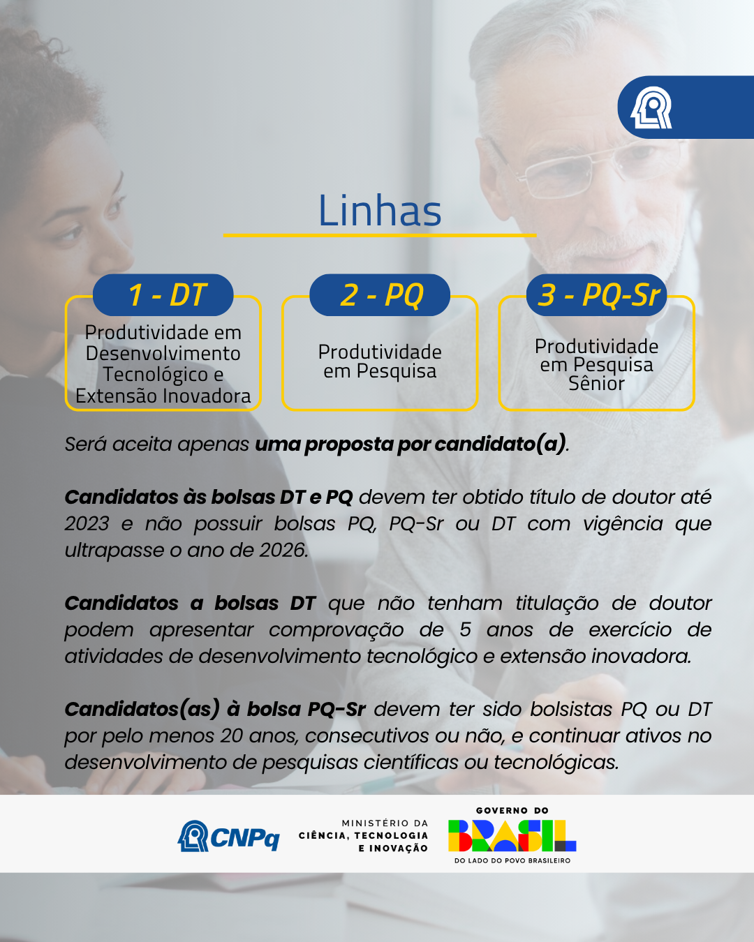 Para os pesquisadores que desejem se concorrer às Linhas 1 (DT) e 2 (PQ), é necessário ter obtido o título de doutor até 2023 e não possuir bolsas nas modalidades PQ, PQ-Sr ou DT com vigência que ultrapasse o ano de 2026.