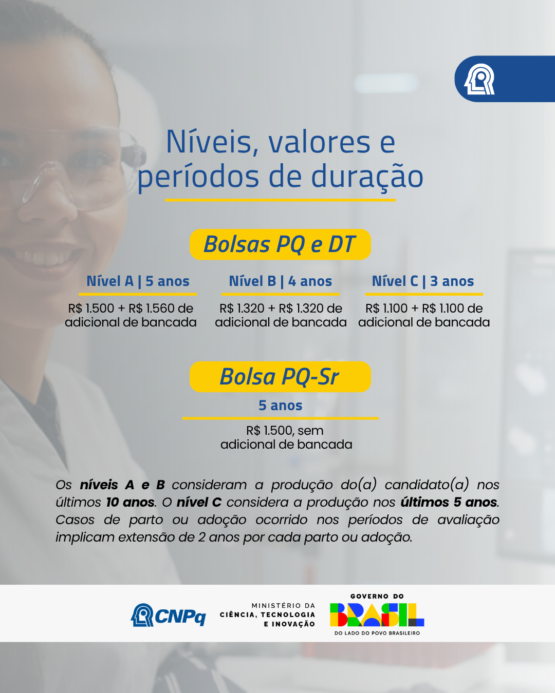 A estimativa de oferta é de 5.499 bolsas PQ/PQ-Sr e 263 bolsas DT, totais que correspondem aos quantitativos atualmente vigentes e que se encerram em 2026. A chamada mantém a nova nomenclatura de níveis das bolsas, que desde o ano passado passaram a variar em três níveis (de “A” a “C”), substituindo a antiga gradação em cinco níveis (de “A” a “E”), conforme a Resolução Normativa 12/2024 do CNPq.