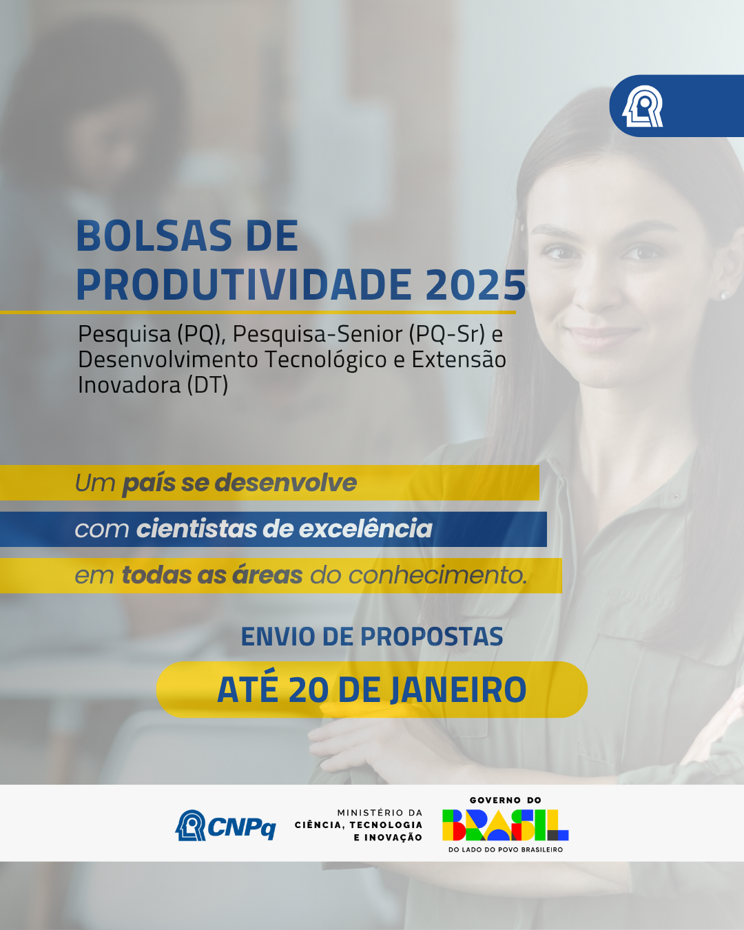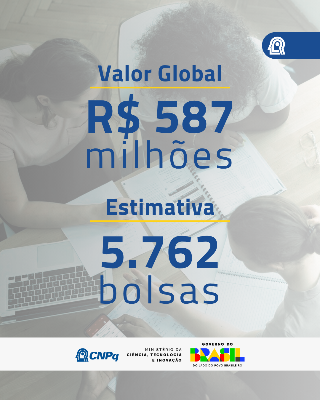 chamada de bolsas de Produtividade em Pesquisa (PQ), Produtividade em Pesquisa Sênior (PQ-Sr) e Desenvolvimento Tecnológico e Extensão Inovadora (DT) prevê a concessão de um total de 5.762 bolsas, com investimento global de R$ 587,4 milhões. As inscrições vão até o dia 20 de janeiro de 2026.