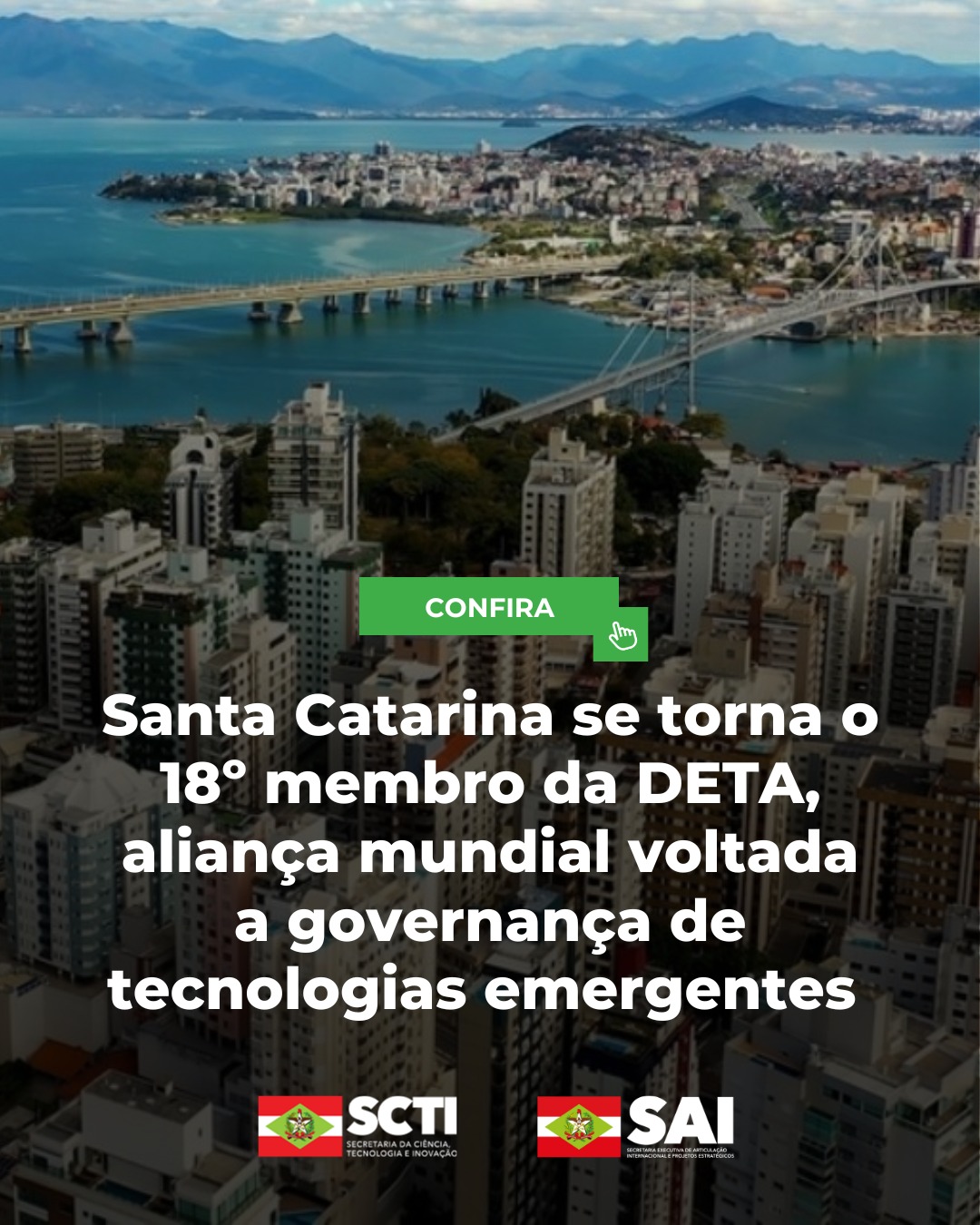 O Estado de Santa Catarina, por meio da Secretaria de Ciência, Tecnologia e Inovação (SCTI) se tornou o 18º membro da Disruptive & Emerging Technology Alliance (DETA), laboratório global de políticas públicas para tecnologias emergentes como inteligência artificial, blockchain e transformação digital. A entrada da SCTI na aliança foi articulada em parceria com a Secretaria Executiva de Articulação Internacional e Projetos Estratégicos de Santa Catarina (SAI) e o Governo da Catalunha, Espanha.